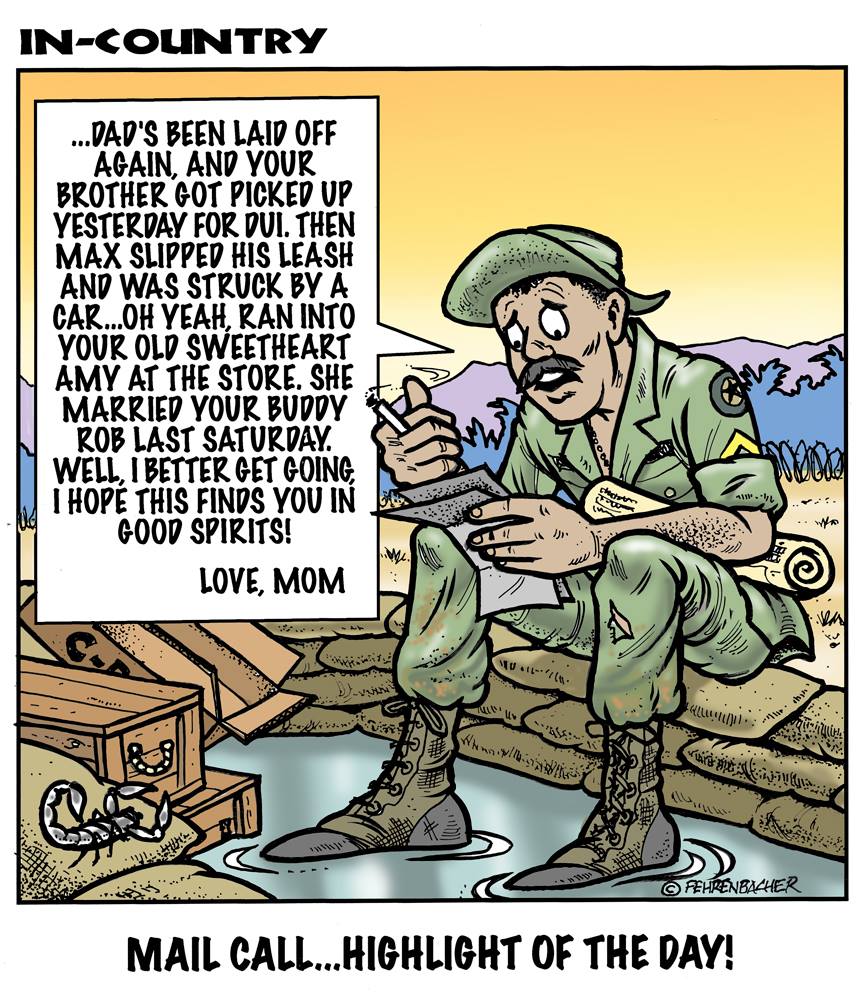 Phil enlisted in the Army in 1965 where you served for years in Vietnam.  He became a graphic designer and has worked for the state of Oregon for 26 years.  He retired in 2003 and started the Cartoon "In-Country".  The cartoons reflect his experiences during his tour of duty in South Vietnam.