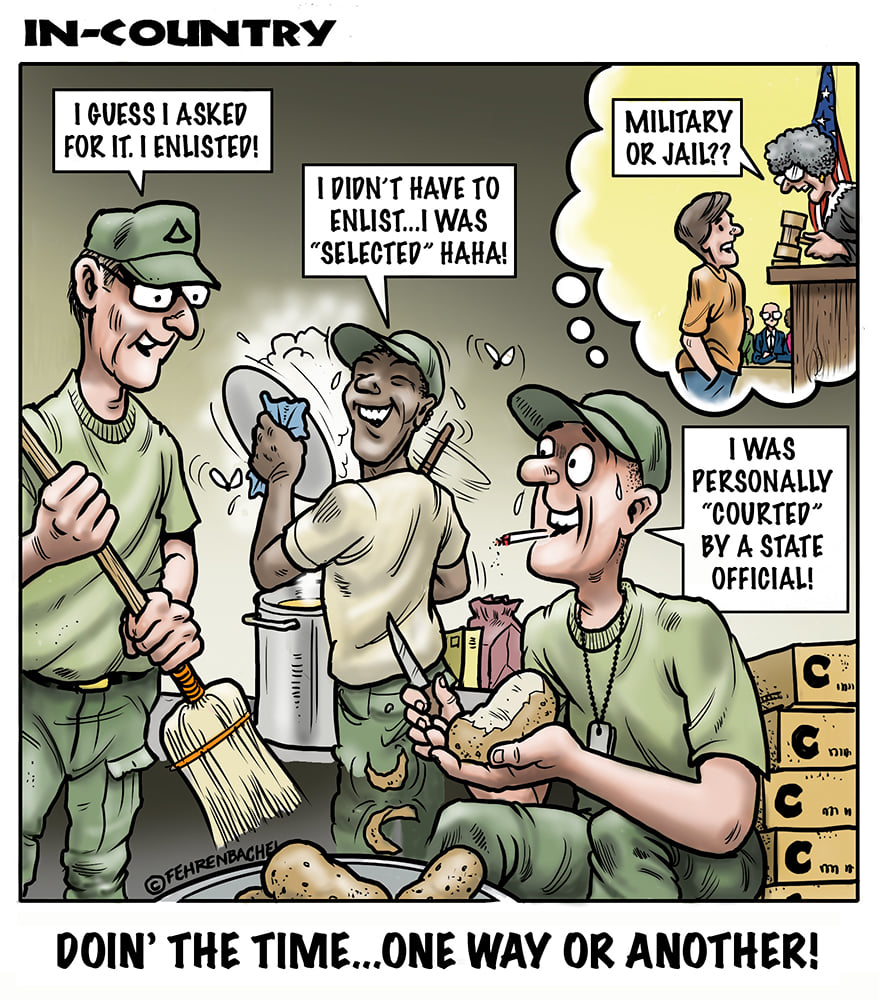 Phil enlisted in the Army in 1965 where you served for years in Vietnam. He became a graphic designer and has worked for the state of Oregon for 26 years. He retired in 2003 and started the Cartoon "In-Country". The cartoons reflect his experiences during his tour of duty in South Vietnam.